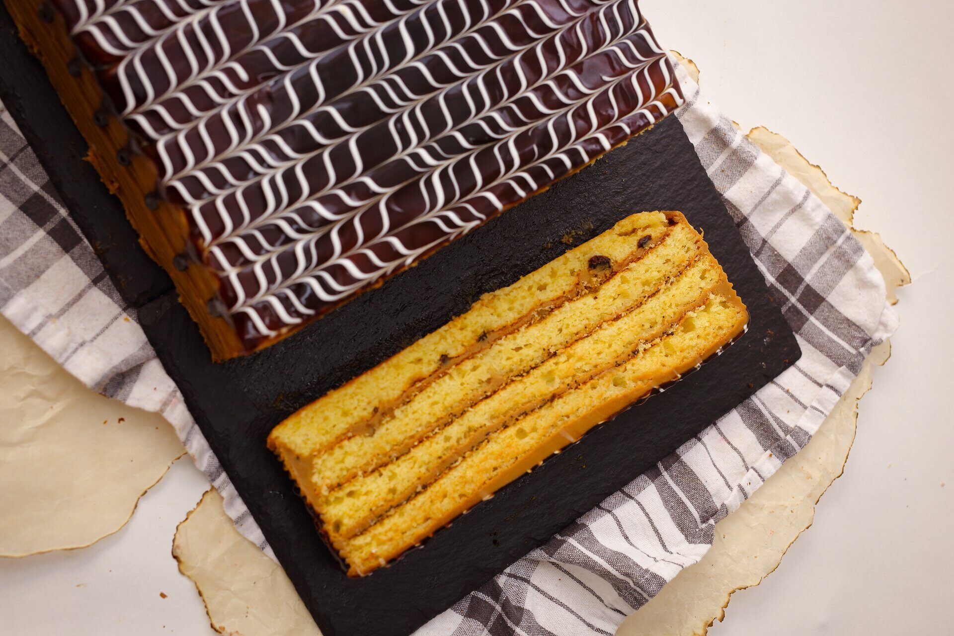 Состав: мука, сахар, яйцо, масло подсолнечное, мак, орех грецкий, изюм, масленный крем, вареное сгущенное молоко, арахис